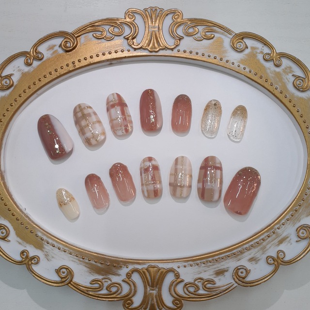 N-00004 やわらかなブラウンとホワイトのチェック柄に、繊細なゴールドラインを合わせた大人可愛いデザインです。 上品なきらめきが指先を明るく見せてくれ、秋冬コーデにもぴったり。 お出かけや日常使い、ギフトにもおすすめです。 デザインポイント ・ゴールドのラメラインが華やかさをプラス ・肌なじみの良いくすみピンクブラウンカラー ・チェック柄とグラデーションで季節感を演出 ・ナチュラルで上品な仕上がり 商品について こちらは一つひとつ丁寧に作成したハンドメイド品です。 細部の色味や配置に若干の個体差がある場合がございます。あらかじめご了承ください。 ※やすり・粘着テープは付属しておりません。お手持ちのもの、または市販のネイル用テープをご使用ください。
