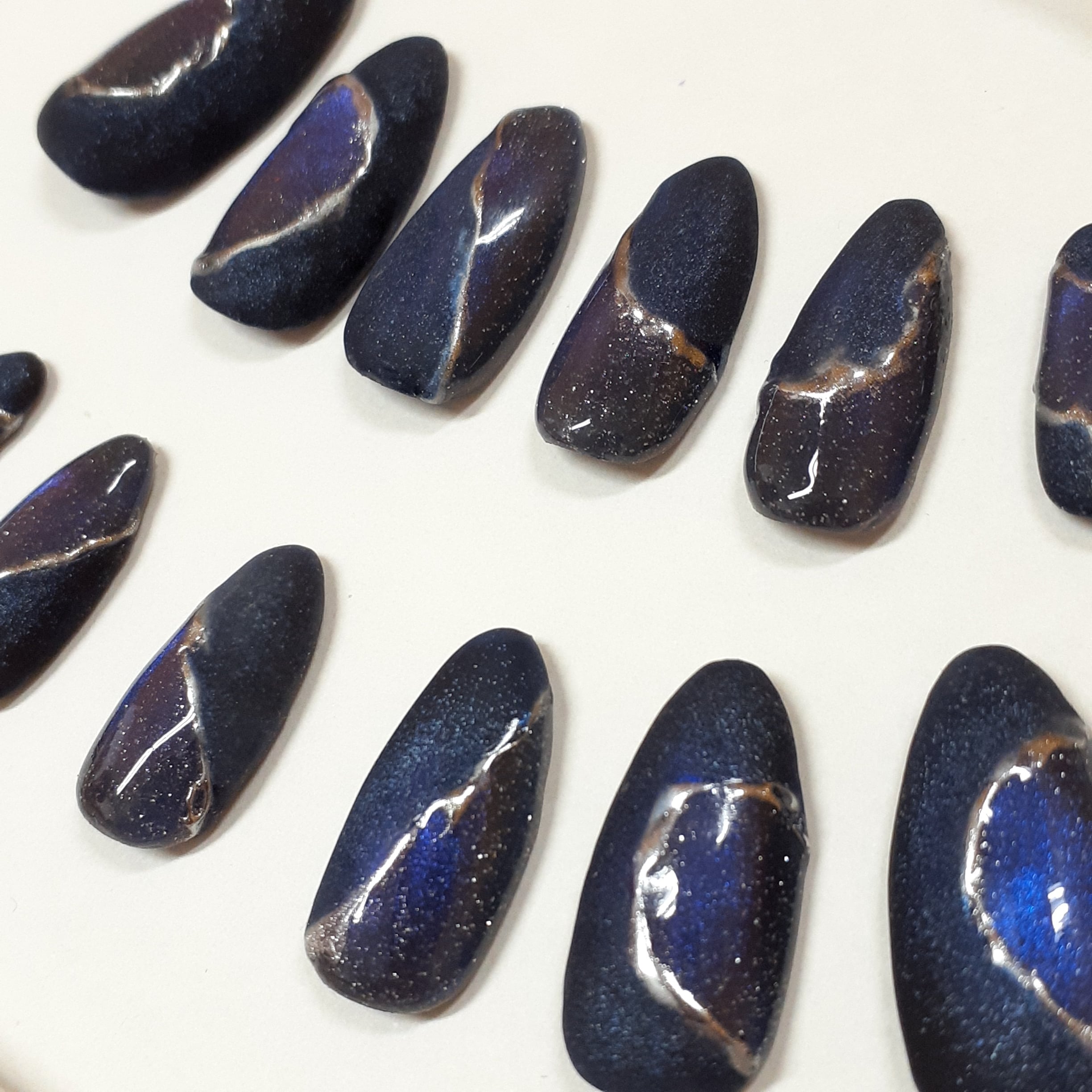 こちらの商品はハンドメイドで一点ずつ制作しております。アートのラインやラメの配置など、写真と全く同じではない場合がございますが、ハンドメイドの個性としてご理解いただけますようお願いいたします。