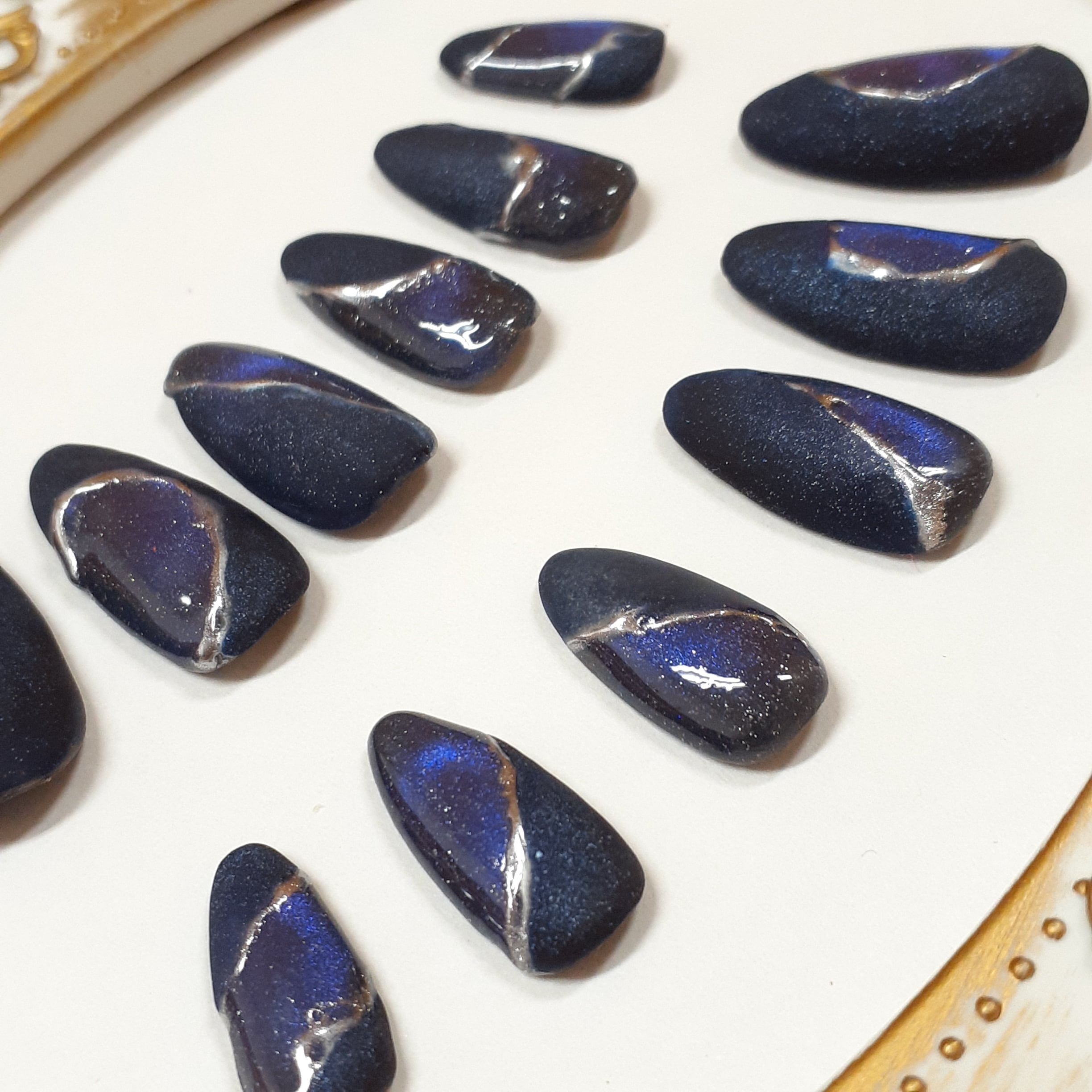 マットな質感のネイビーと、角度によって青く輝くマグネットジェルの光が織りなすコントラストが印象的。不規則に描かれたメタリックラインは、夜空を横切る流れ星や、氷の表面に走る亀裂のような美しさを感じさせます。