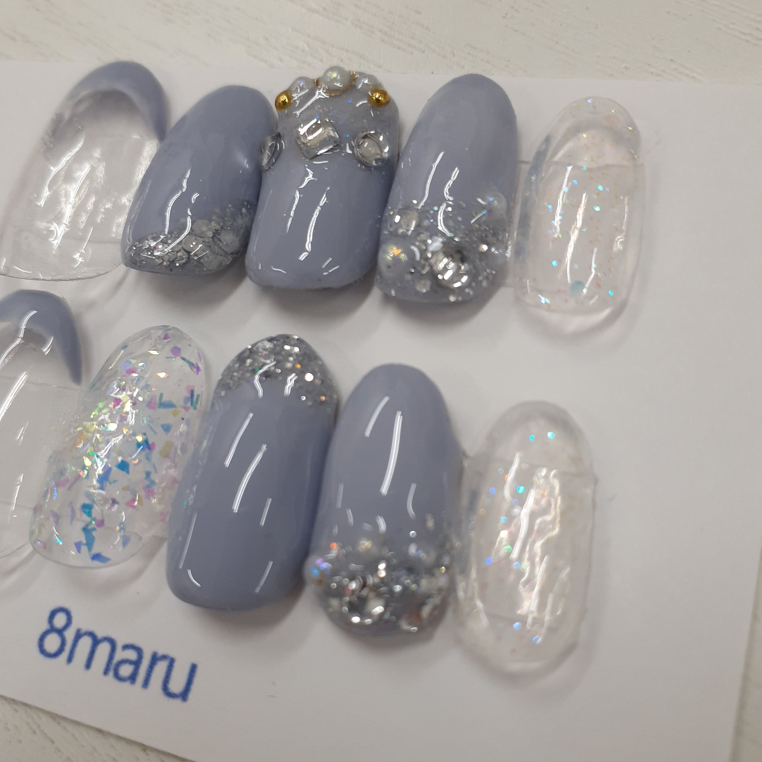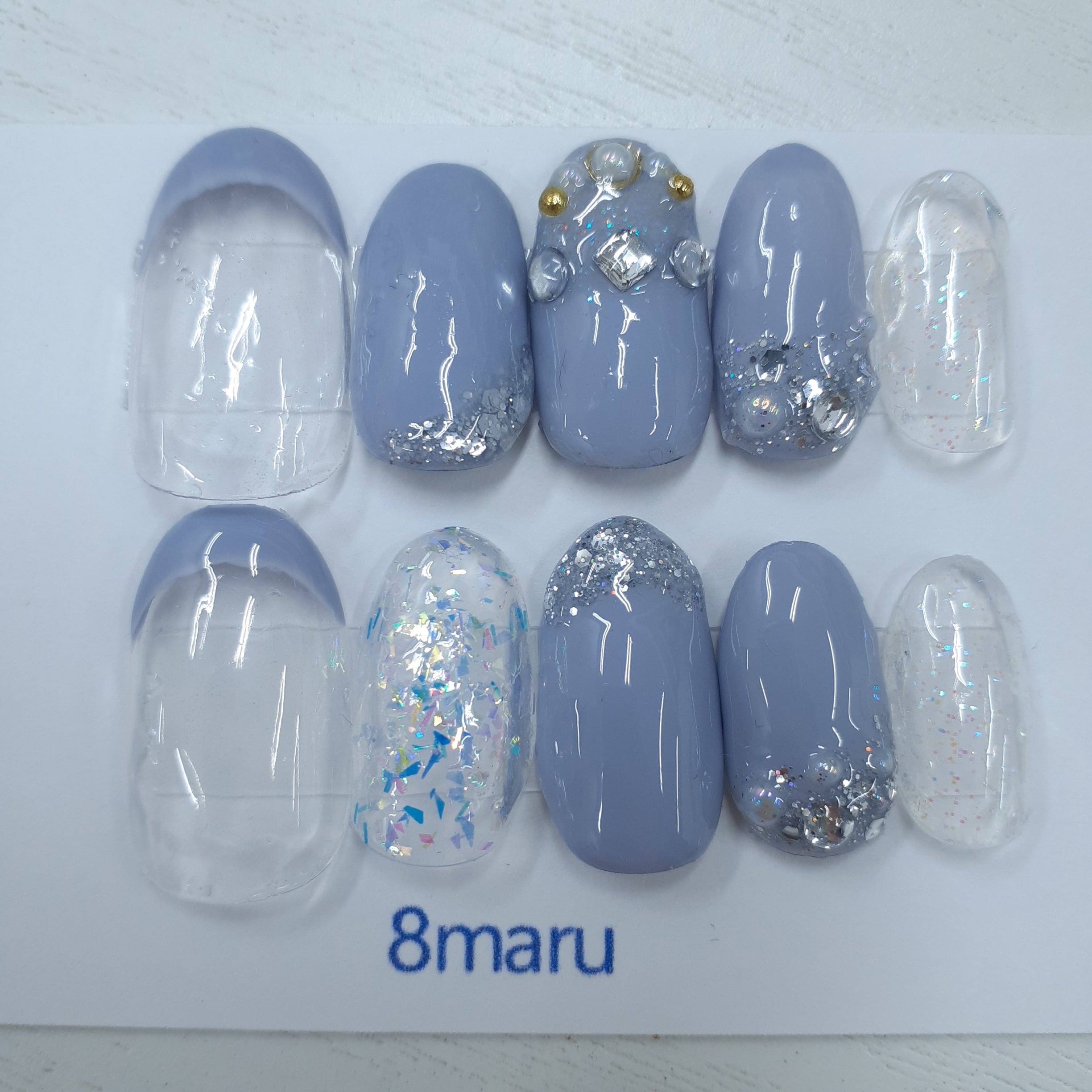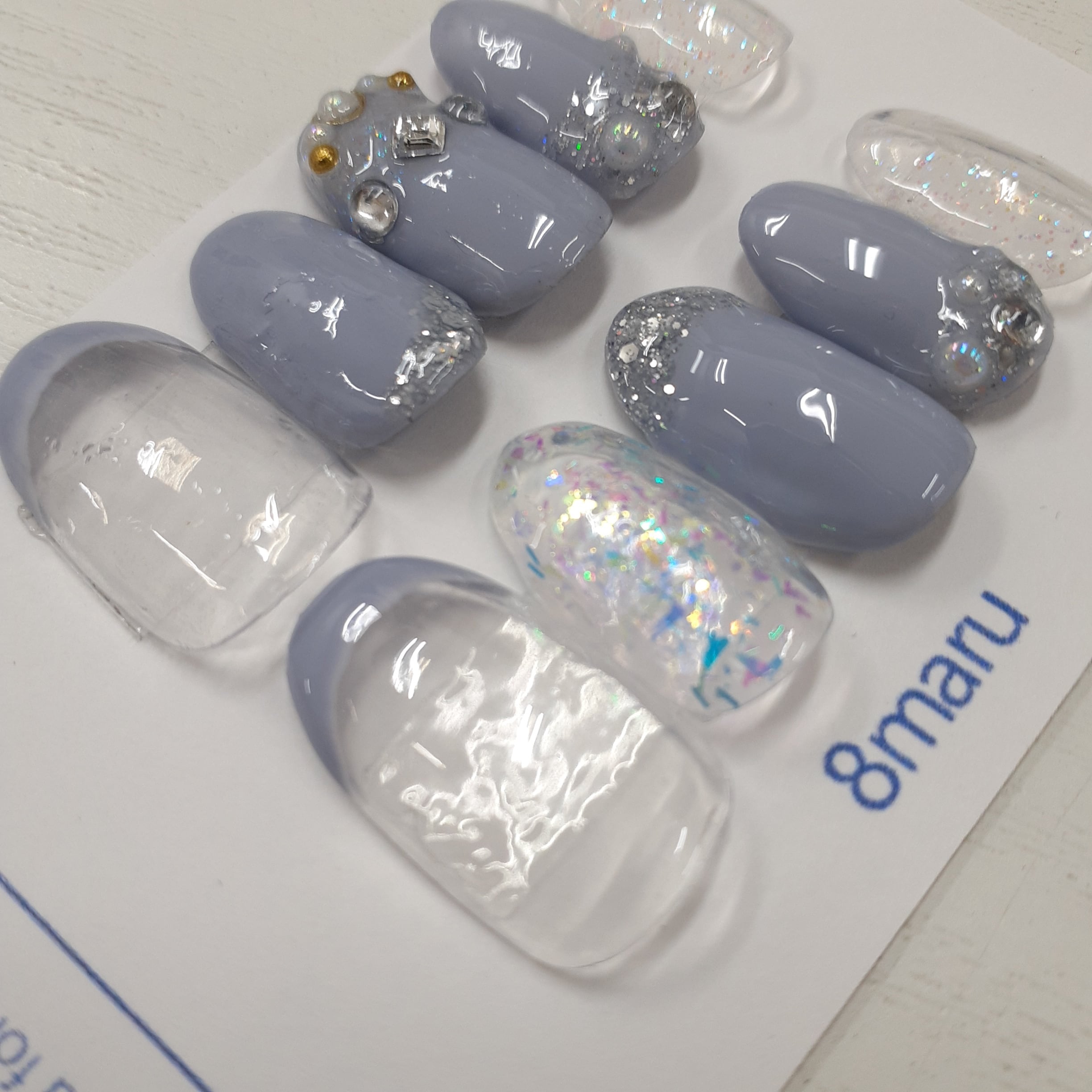 落ち着いたスモーキーブルーをベースに、透明感のあるクリアラメやパーツを組み合わせた上品なネイルチップです。