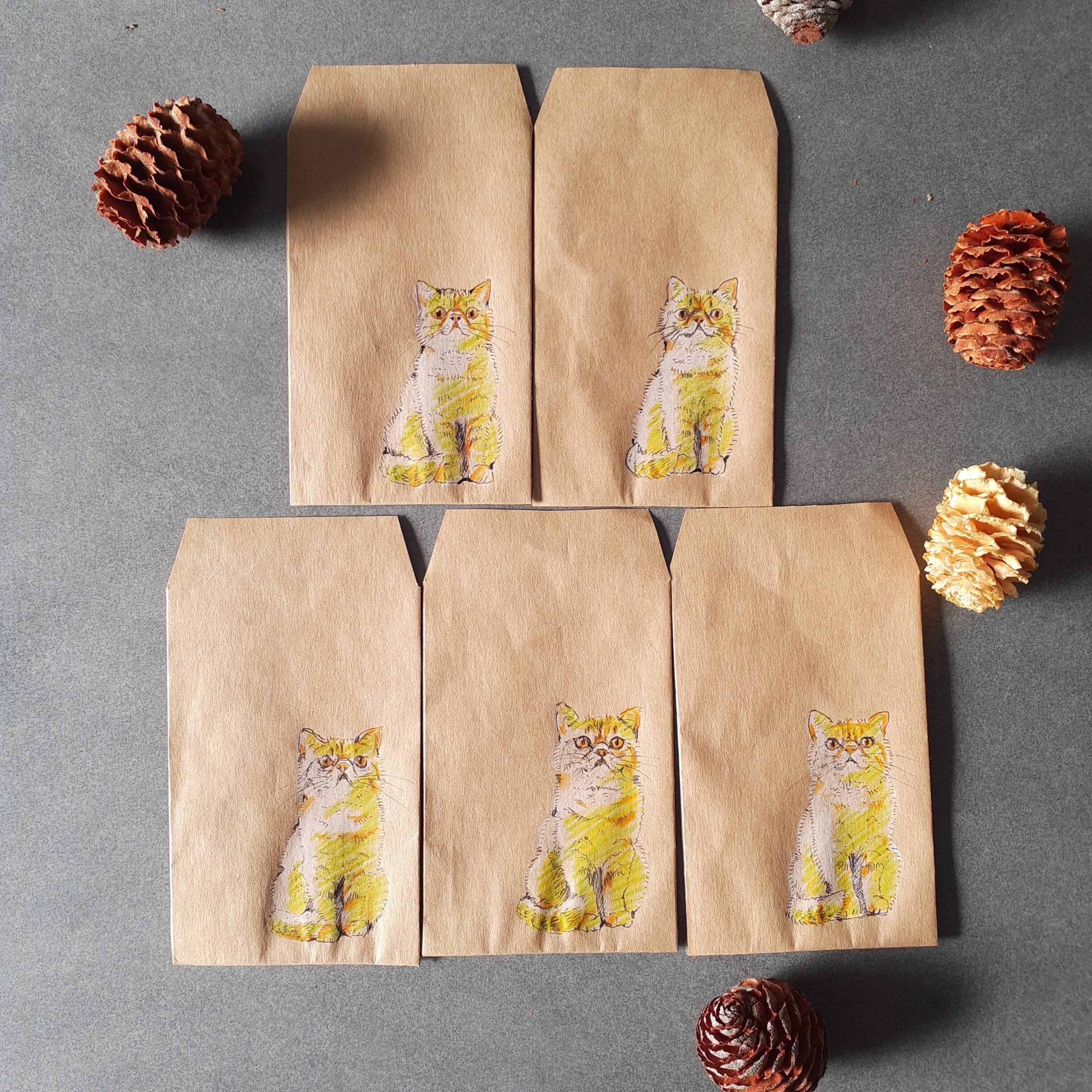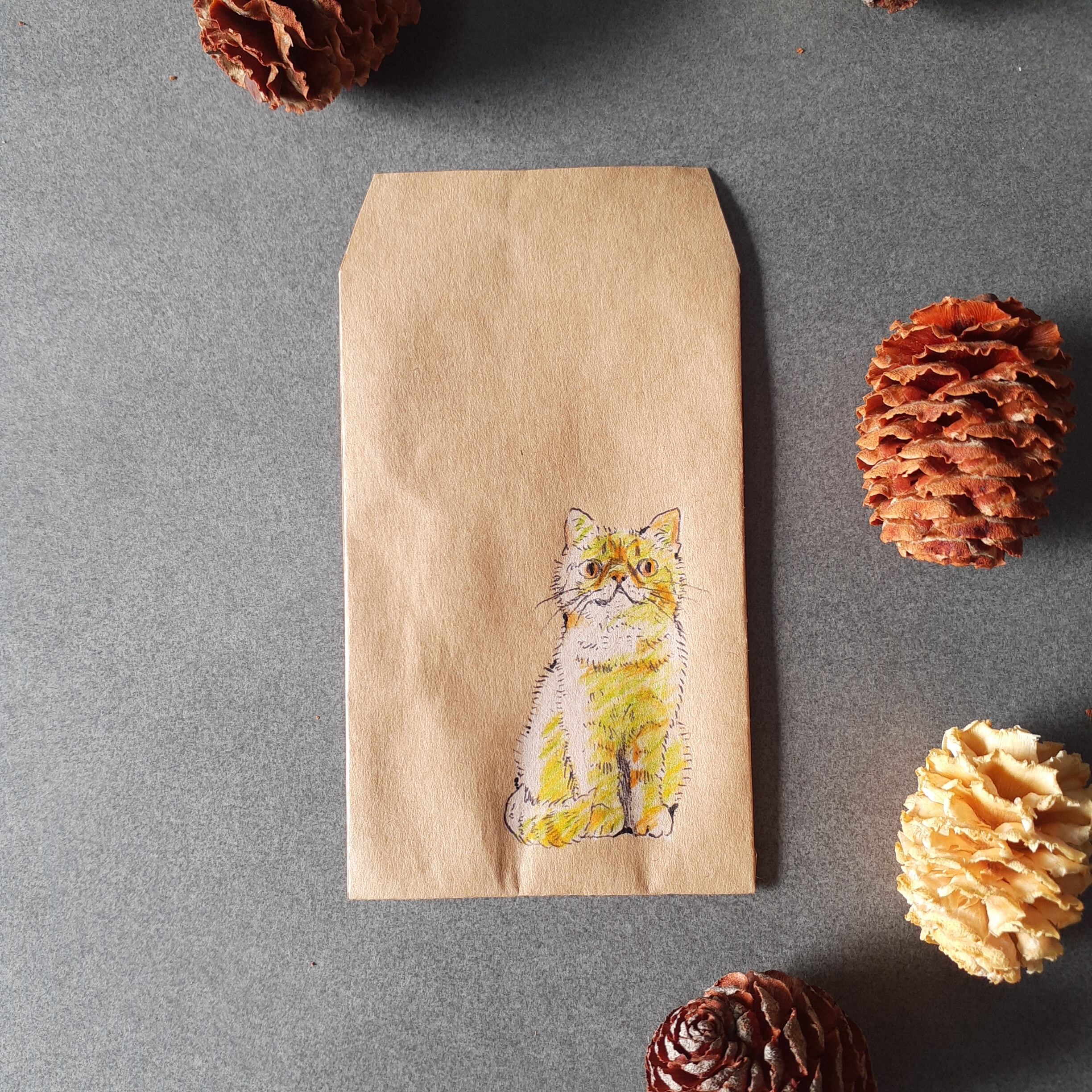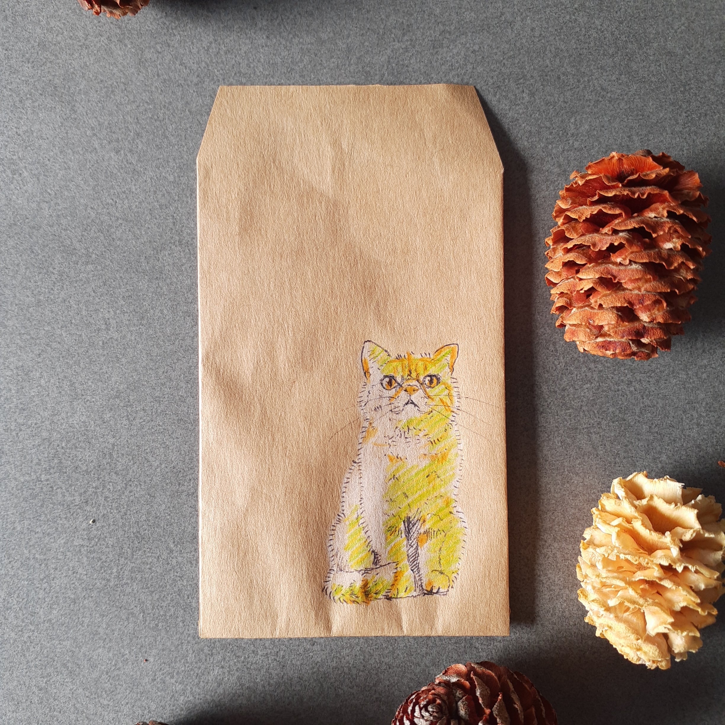 やさしい風合いのクラフト紙に、ちょこんと座る猫のイラストをあしらったポチ袋です。