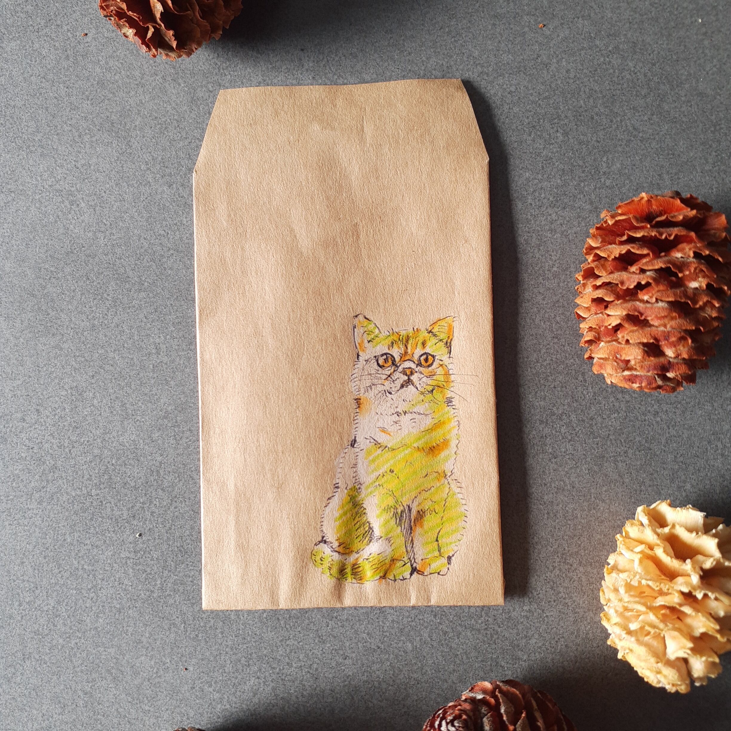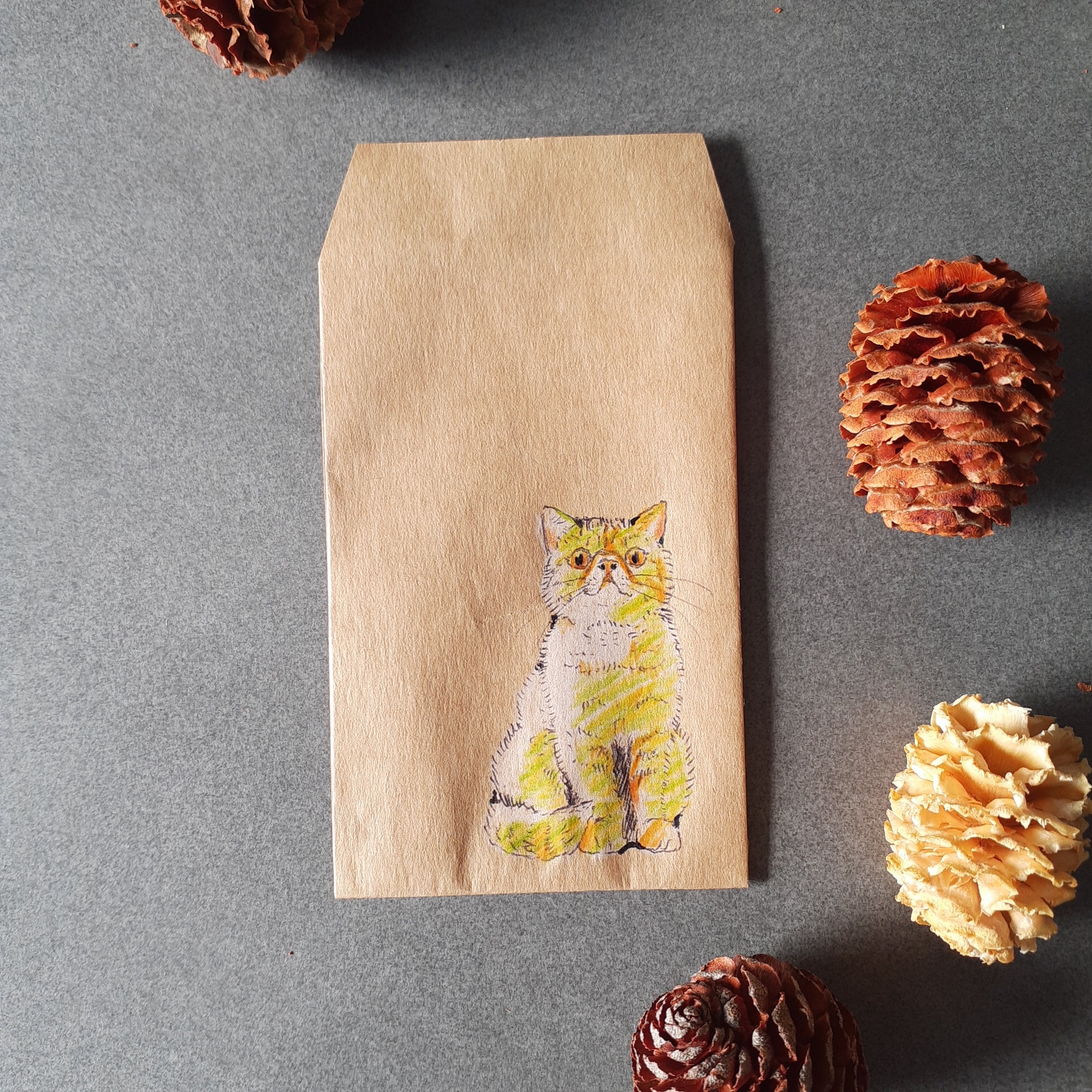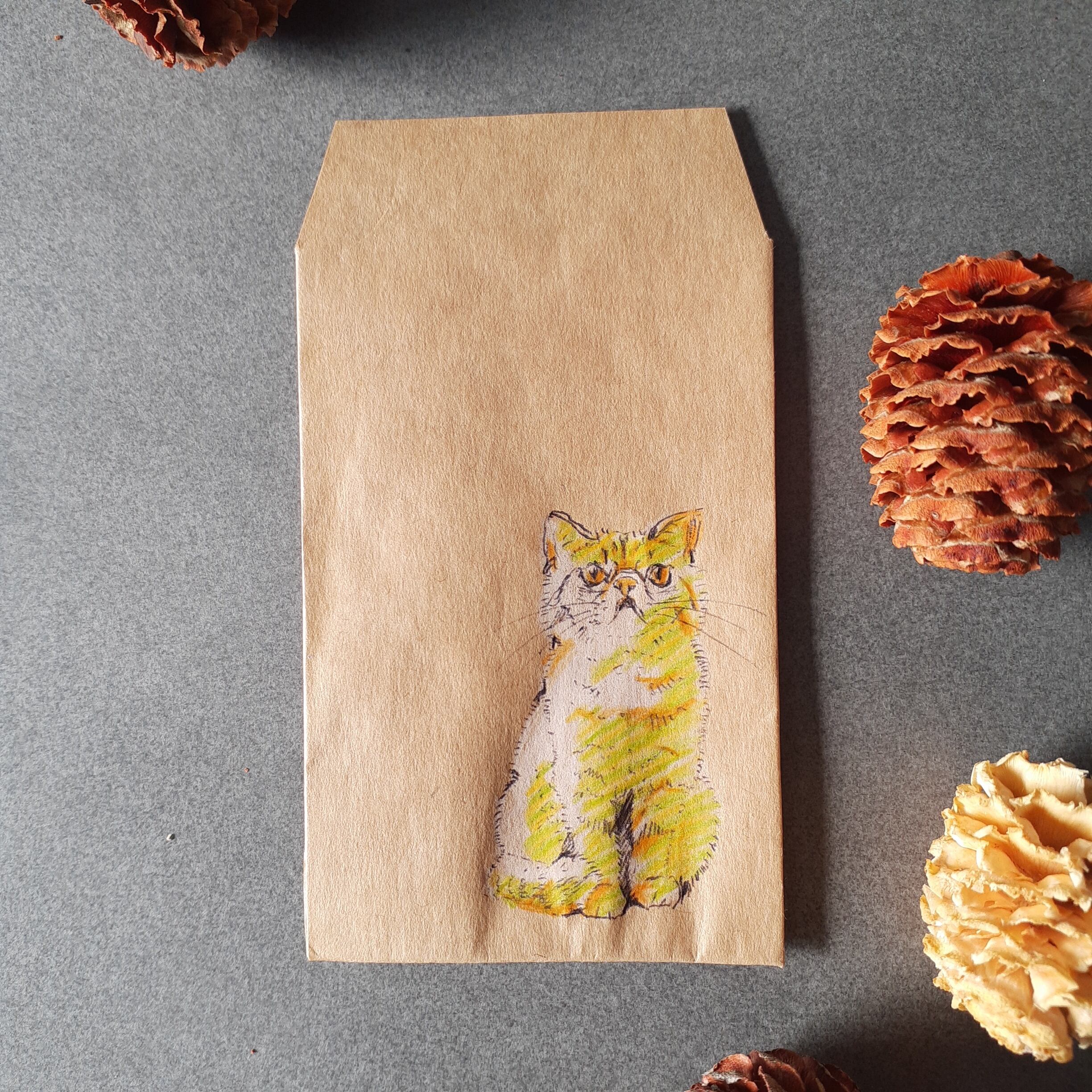 やさしい風合いのクラフト紙に、ちょこんと座る猫のイラストをあしらったポチ袋です。