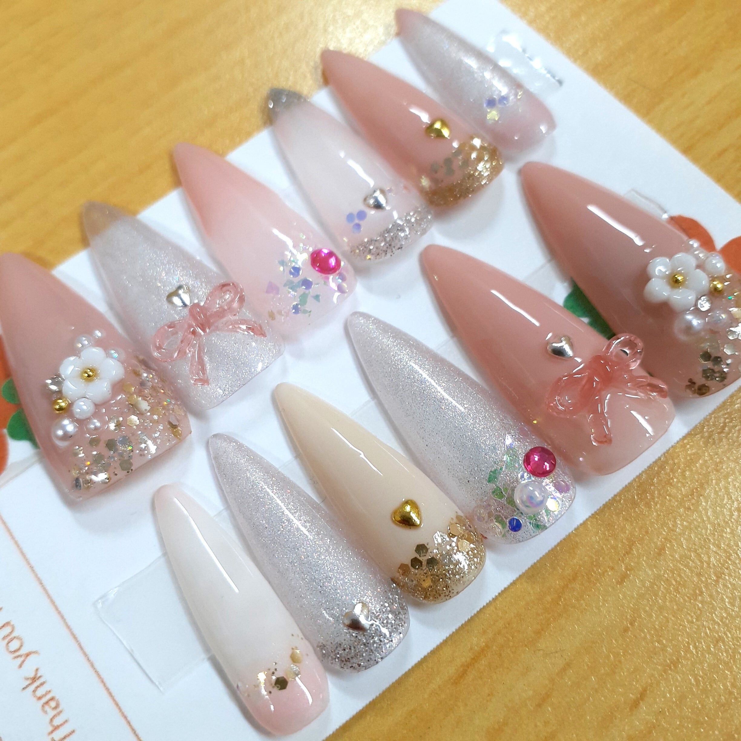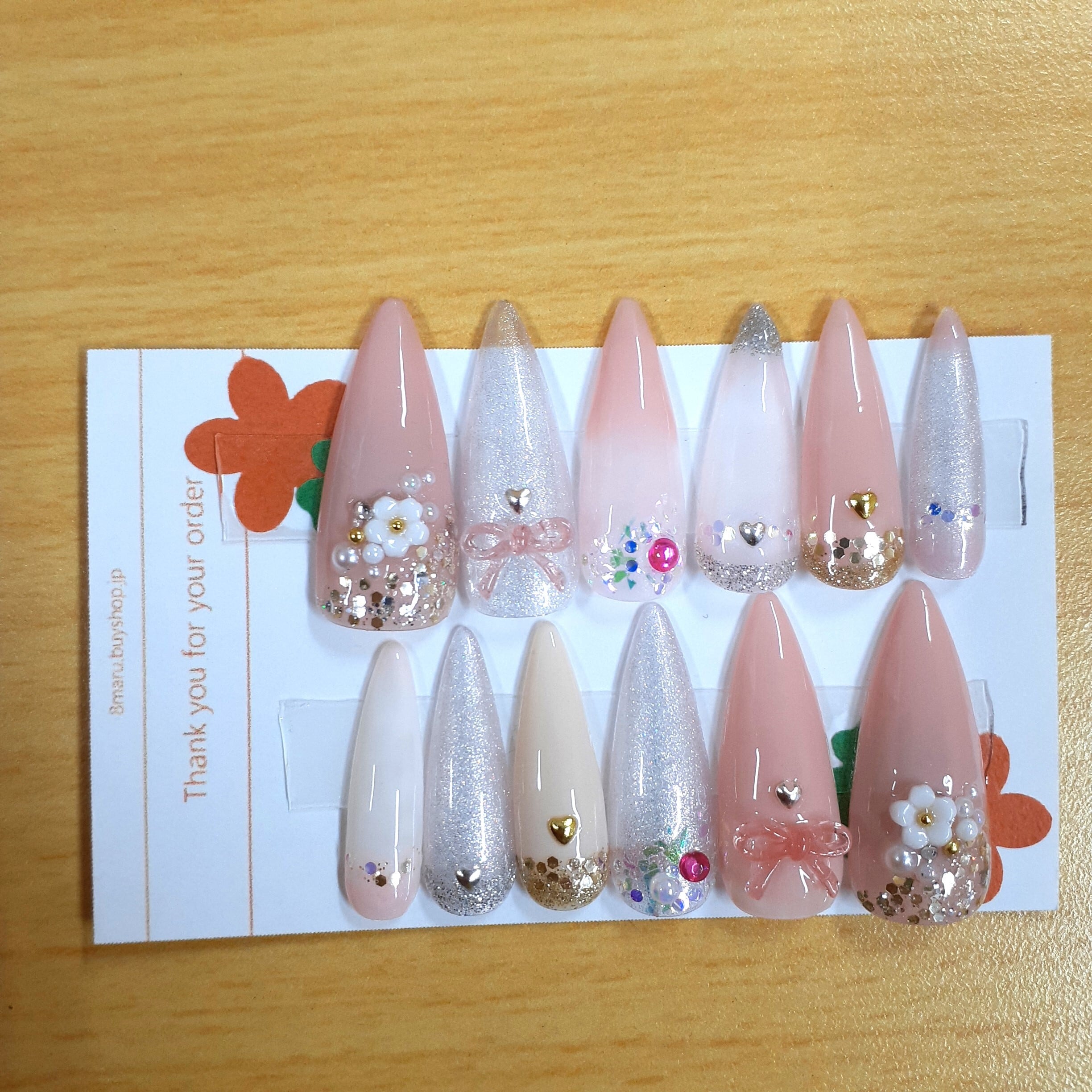 やさしいピンクカラーをベースに、シルバーラメやフラワー、リボン、ハートモチーフを組み合わせた、上品で可愛らしいネイルチップです。
