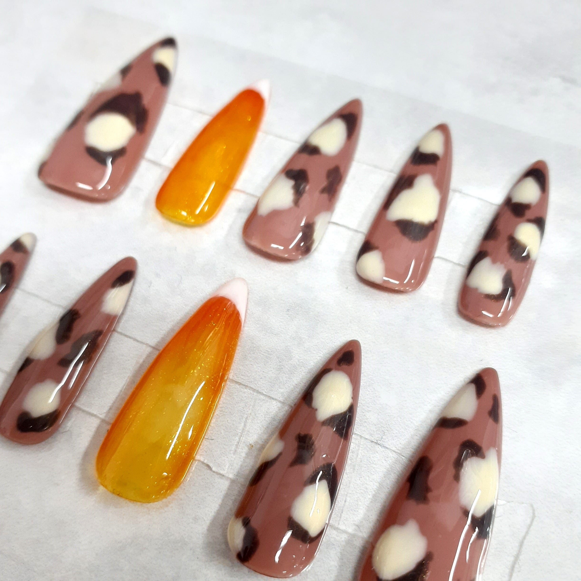 ベースには落ち着いたモーブブラウンを使用し、ミルキーなスポットアートでやわらかく上品なヒョウ柄に仕上げました。