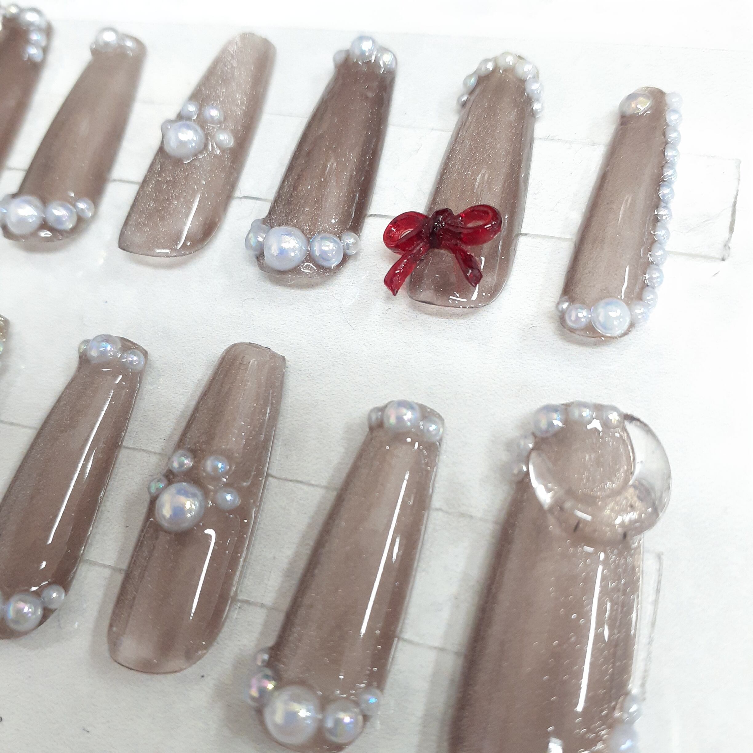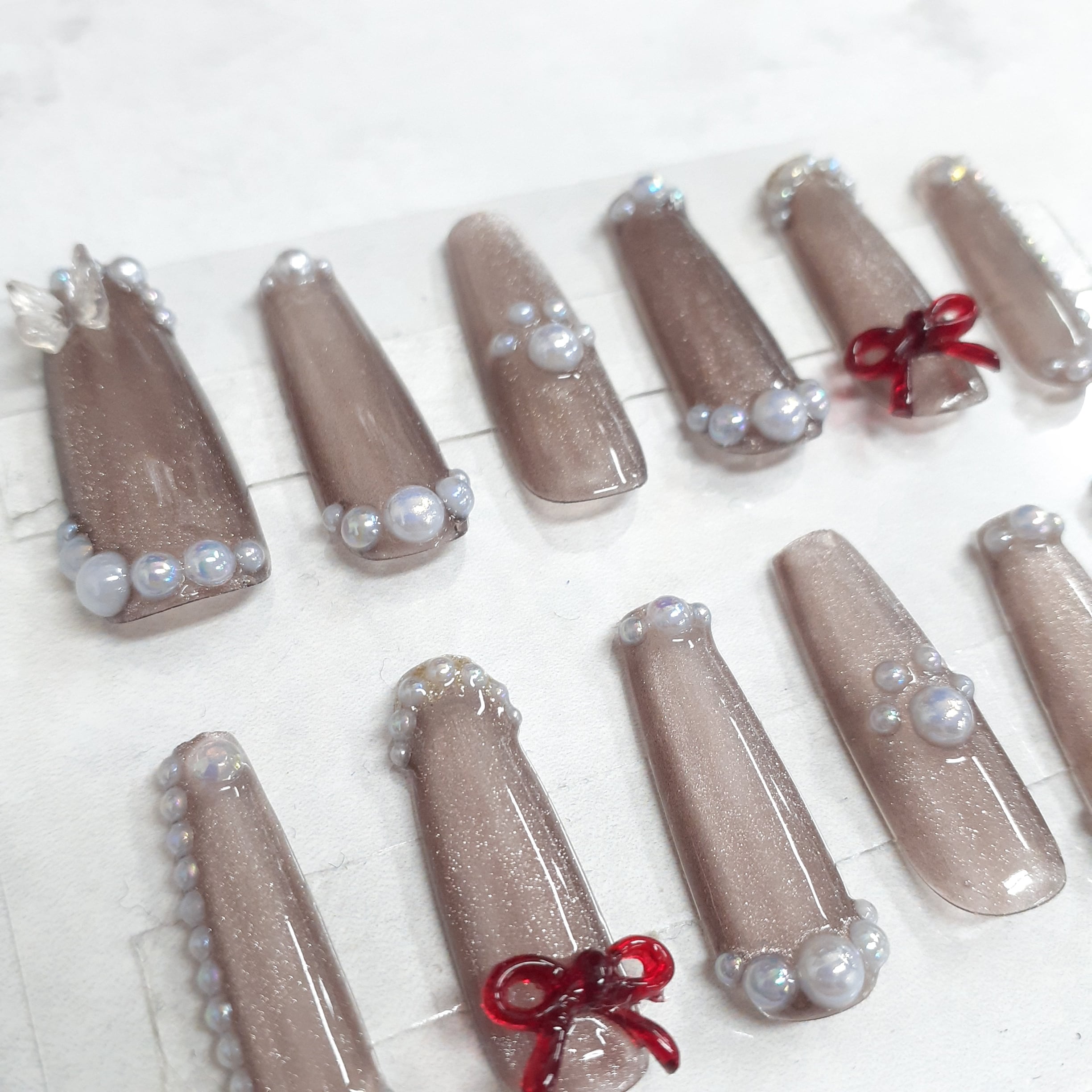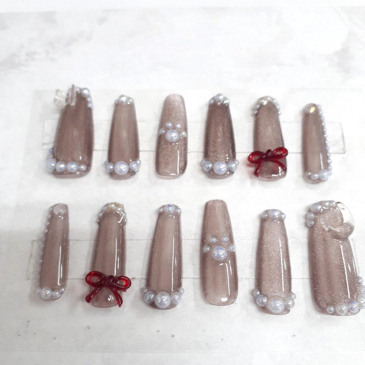 やさしく甘いミルクショコラブラウンをベースに、マグネットジェルの奥行き感と上品なパール・リボンを組み合わせた大人可愛いネイルチップです。光の角度によってきらりと表情が変わるマグネット特有のうるっとした輝きが、手元をより立体的で華やかに見せてくれます。